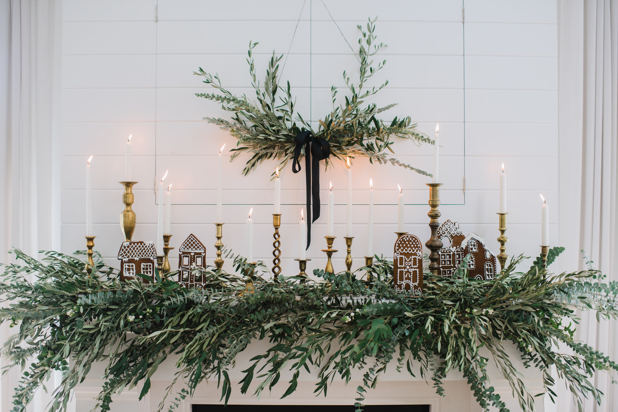 3. Adding brass candlesticks and taper candles is sure way to create interest on the mantel. Always work in odd numbers for the most cohesive look. The same rule would apply with glitter houses, these always are a favorite at Christmas.