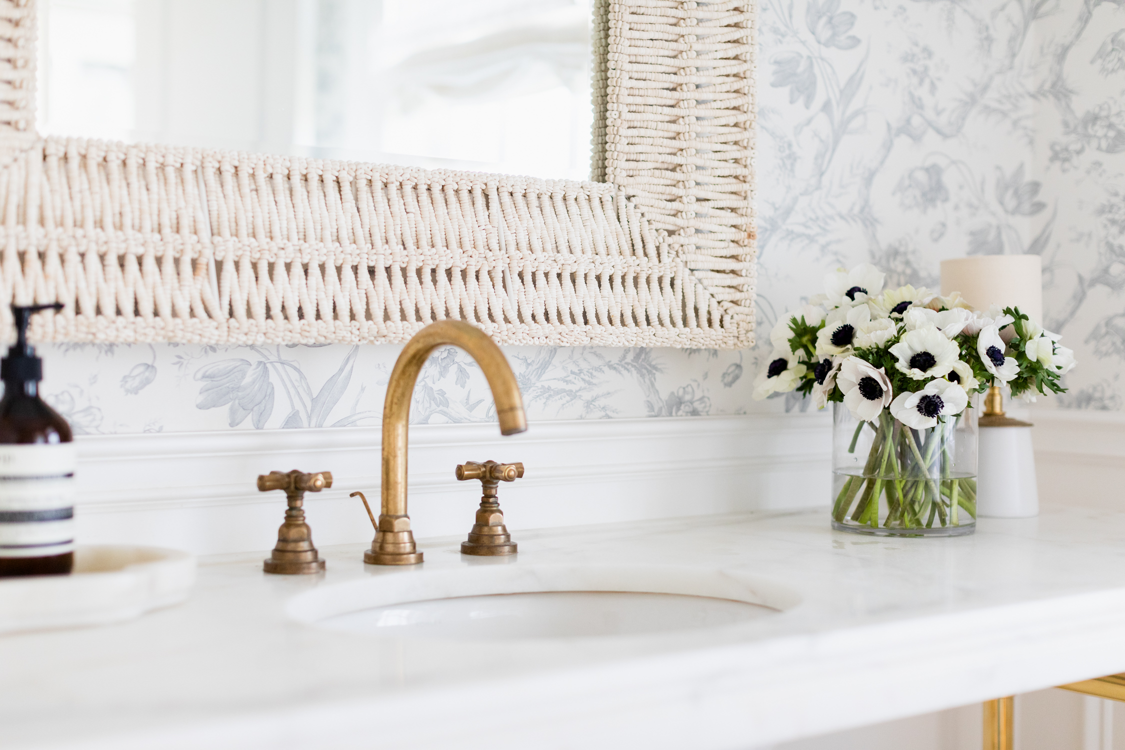 Mirrors are another piece in the powder room where you experiment and make more of a statement. I went with a fairly large and beaded mirror that adds beautiful overall texture to the space. The mirror has a beveled edge with layered coco shell beads, giving it a natural and relaxed, but yet sophisticatd feel.