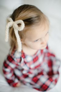 white yarn bow in hair