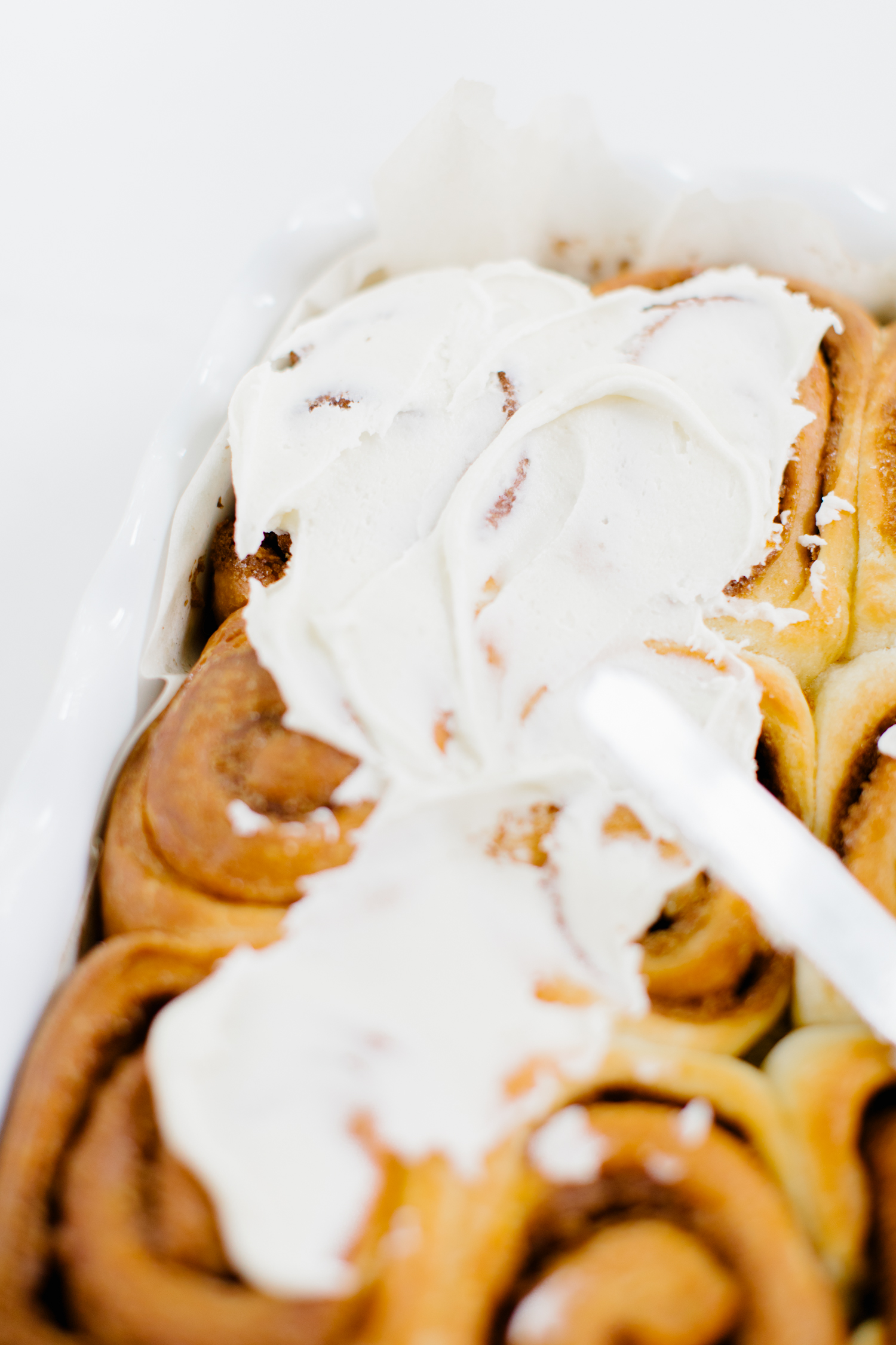 9. If you choose to ice your cinnamon buns, simply mix all of the ingredients for the icing and spread on top of the cooled buns.